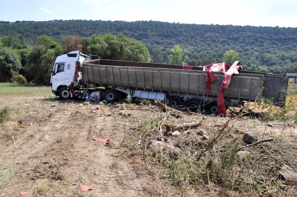 El vehículo pesado se salía de la carretera con toda su carga a una finca cercana al no poder frenar a tiempo a causa de la pronunciada pendiente de la N-232 hacia el cruce que la une con la CL-629.