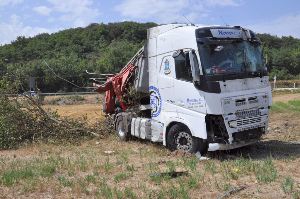 Un camión cargado de madera se salía de la calzada en el cruce hacia Soncillo, en la localidad de Incinillas, en el municipio de Villarcayo.