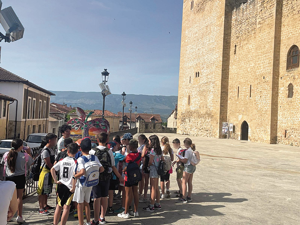 Una de las propuestas más innovadoras fue la actividad de “visita virtual” al casco histórico de Medina de Pomar, dirigida a niñas y niños de Educación Infantil y del aula de Unidad de Educación Especial. Gracias a una adaptación didáctica realizada en el polideportivo del centro, el casco histórico “viajó” hasta el colegio mediante un juego de búsqueda de pegatinas que representaban los principales monumentos y lugares emblemáticos de la ciudad, acompañados de pequeñas explicaciones. En total, participaron 177 escolares en esta original propuesta.