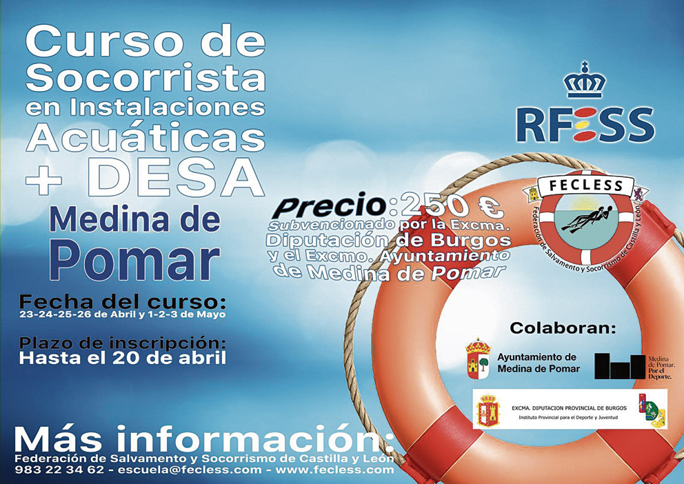 El curso de Socorrista en Instalaciones Acuáticas + DESA se impartirá los días 23, 24, 25, 26 de abril y 1, 2 y 3 de mayo. El plazo de inscripción es hasta el 20 de abril. Más información en 983 22 34 62.