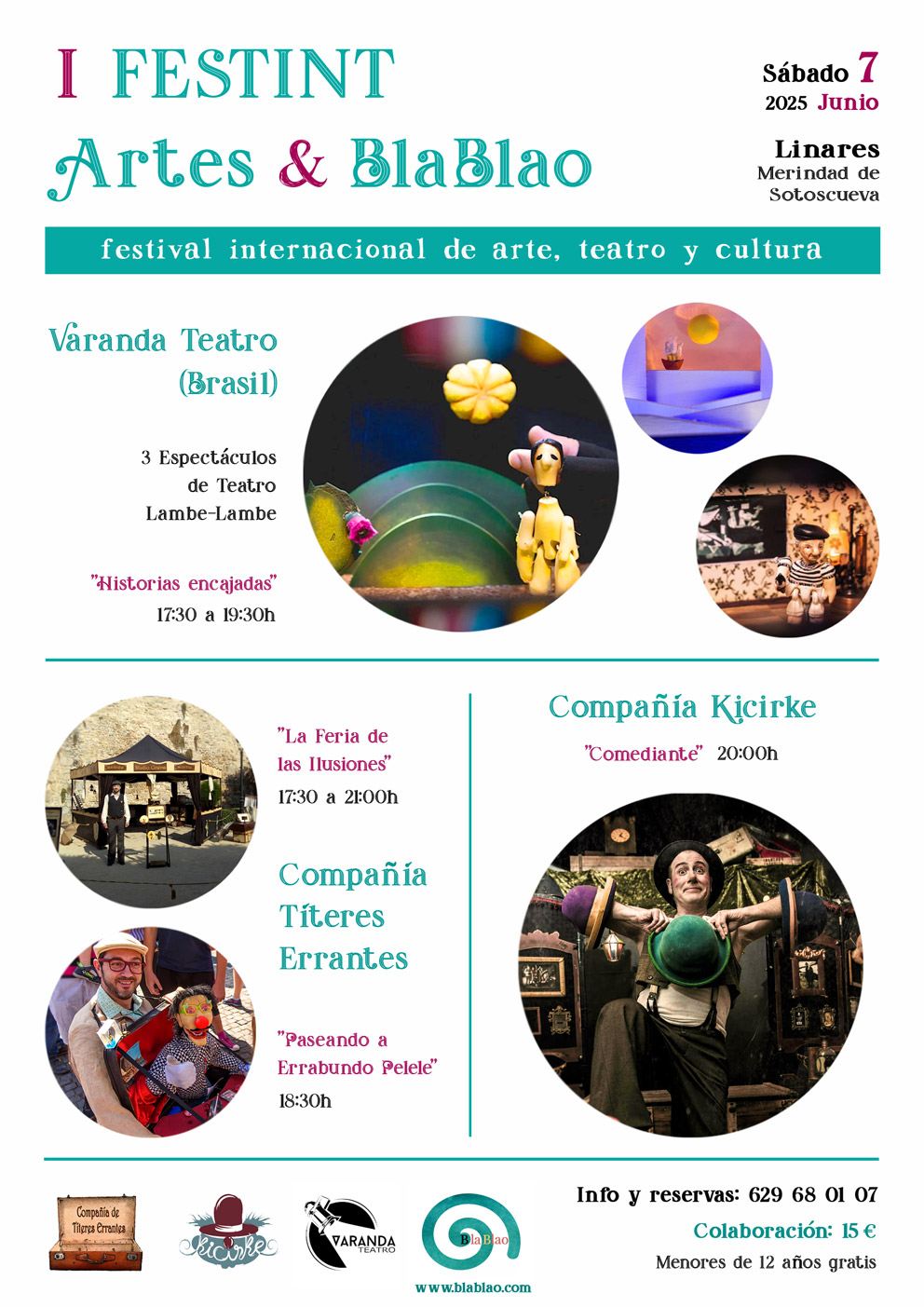 ElI FESTINT Artes&BlaBlao tendrá lugar el sábado 7 de junio desde las 17:30h en Linares (Merindad de Sotoscueva). El festival se organiza de manera autogestionada por el proyecto BlaBlao, con una colaboración de 15€ por persona (menores de 12 años gratis), que será destinada íntegramente a las compañías participantes. Para más información y reservas contactar con el número 629680107 (teléfono, whatsapp o telegram).