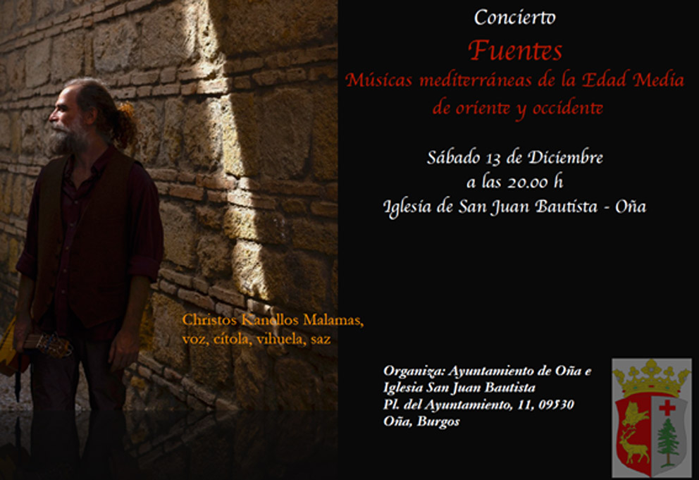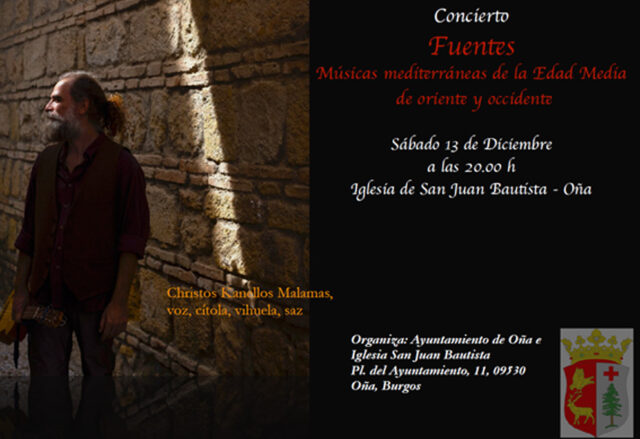 La iglesia de san Juan Bautista de Oña acogerá el próximo 13 de diciembre a las 20:00h. el concierto Fuentes: Músicas mediterráneas de la Edad Media de oriente y occidente, a cargo del músico Christos Kanellos Malamas, que será la voz y tocará la cítola, vihuela y el saz.