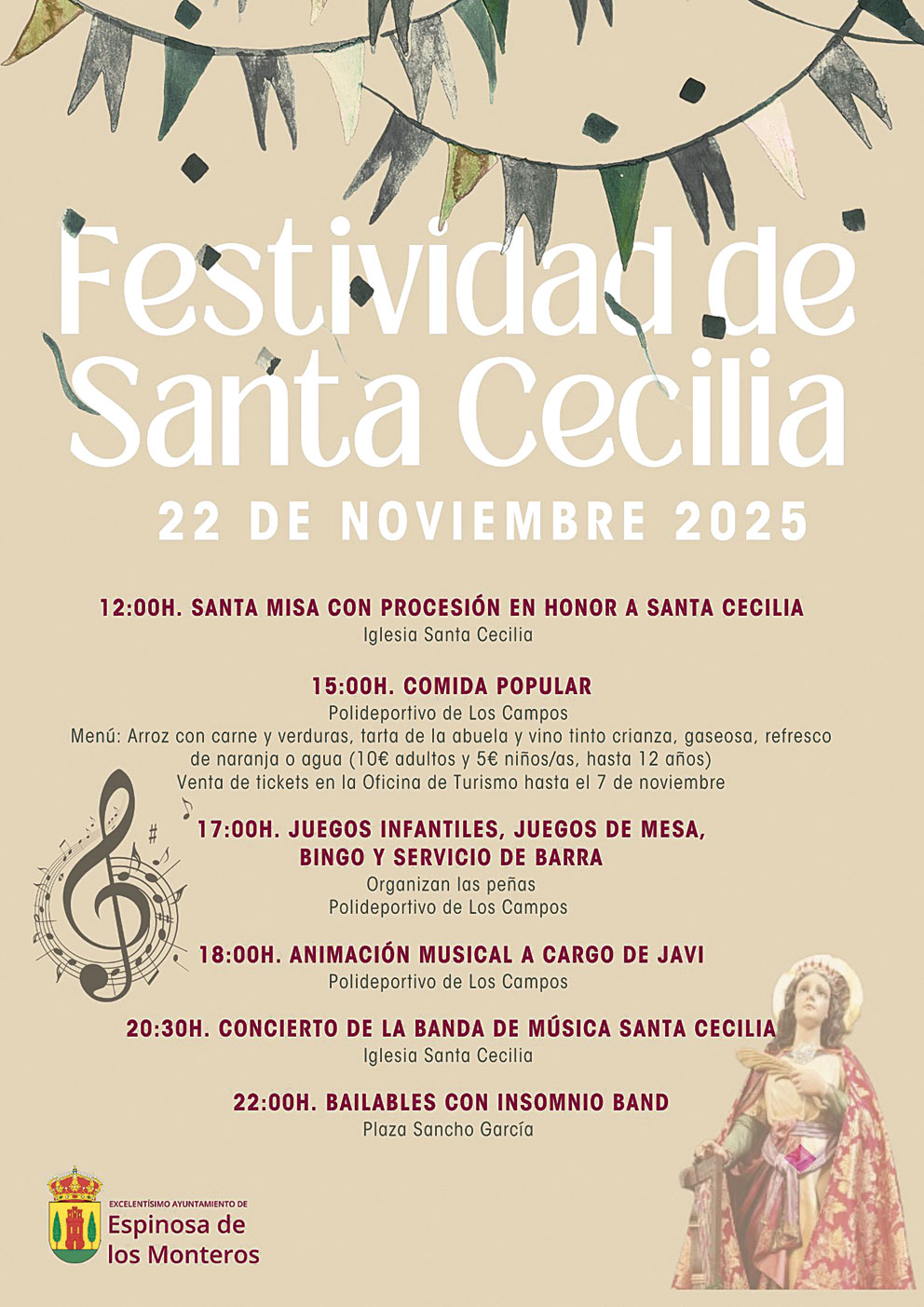 El Ayuntamiento de Espinosa de los Monteros ha preparado una completa programación para conmemorar la Festividad de Santa Cecilia, patrona de Espinosa de los Monteros, el próximo sábado 22 de noviembre de 2025.