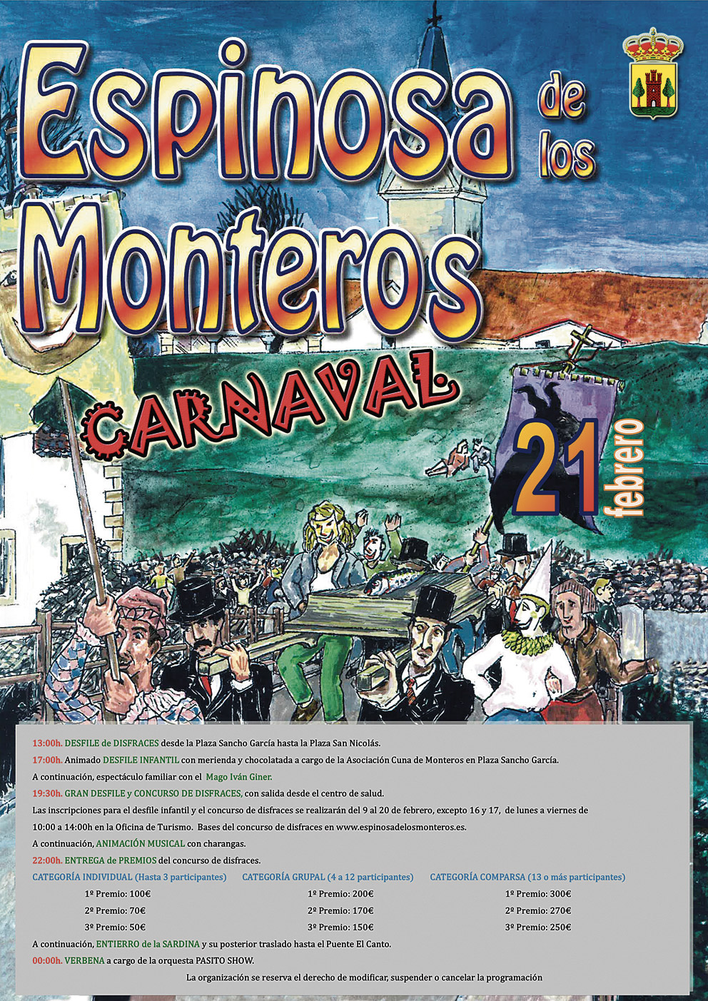 A las 19:30 horas, se celebrará el gran desfile de disfraces con concurso. Las inscripciones para el concurso estarán abiertas del 9 al 20 febrero, excepto 16 y 17, de lunes a viernes, en horario de 10:00 a 14:00 horas. Las bases pueden consultarse en la página web municipal, www.espinosadelosmonteros.es