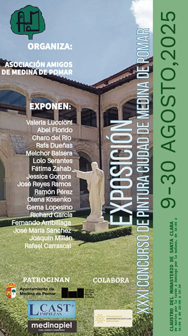 El sábado 9 de agosto a las 20:00 en el Claustro del Monasterio de Santa Clara será inaugurada la exposición de la XXXI edición del concurso de pintura Ciudad de Medina de Pomar y XVI edición del certamen infantil y juvenil.