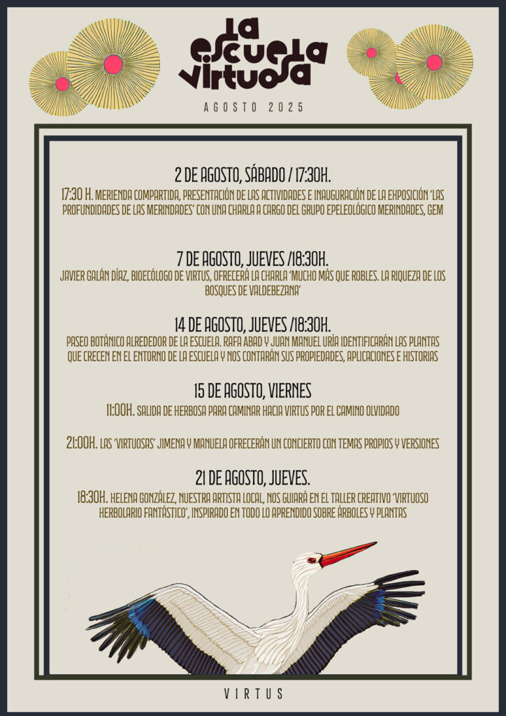 “La Escuela Virtuosa” abrió sus puertas este sábado, 2 de agosto, con una programación que en esta cuarta edición prestará especial atención a la riqueza vegetal de la zona de Virtus, sede de esta iniciativa. Hasta el 21 de agosto se sucederán las distintas actividades programadas, que se celebrarán en su mayor parte en la vieja escuela del pueblo e incluyen una exposición sobre las cuevas de Valdebezana, con una conferencia a cargo del Grupo Espeleológico Merindades, GEM; una charla sobre la riqueza de los bosques del valle; un paseo botánico por las inmediaciones de la escuela; una ruta a pie entre Herbosa y Virtus; un concierto, y un taller de creación artística en torno a las plantas que crecen por los campos del pueblo.