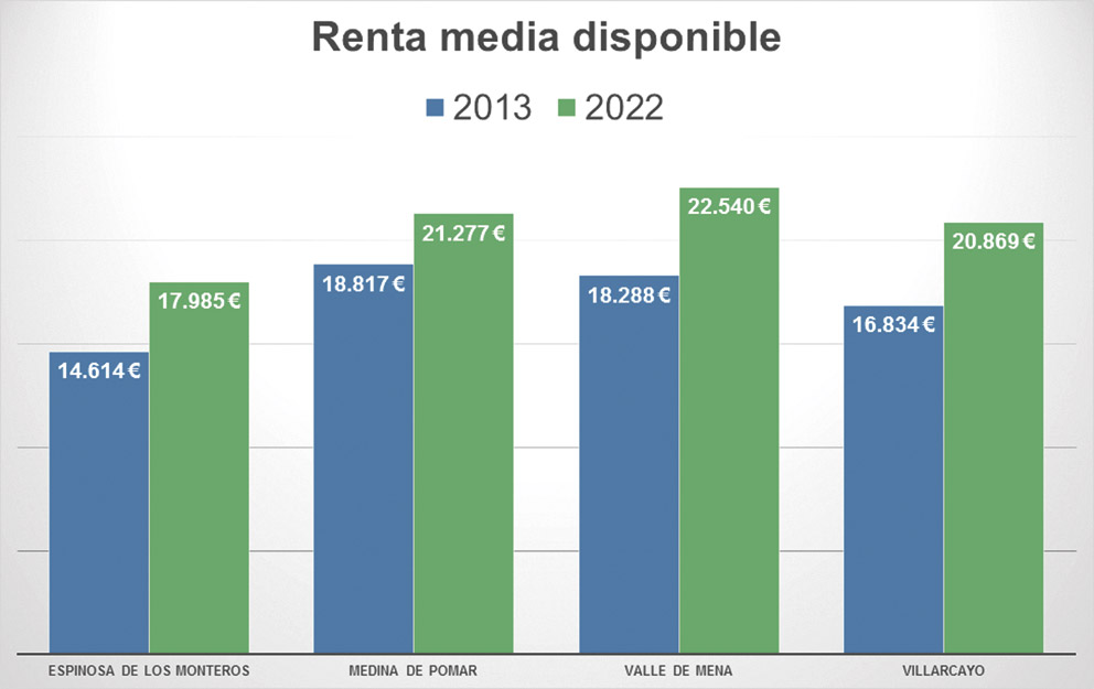 Por su lado, Medina de Pomar, registró un incremento del 13,1%, pasando de 18.817 euros en 2013 a 21.277 euros en 2022. El Valle de Mena registró un aumento del 23,3 % durante el mismo periodo, pasando de 18.288 euros en 2013 a 22.540 euros en 2022, reflejando un crecimiento significativo, especialmente a partir de 2014. Por su parte, Villarcayo experimentó un incremento del 24,4 %, al elevar su renta media de 16.834 euros en 2013 a 20.869 euros en 2022, destacando una tendencia de crecimiento constante y sostenido.