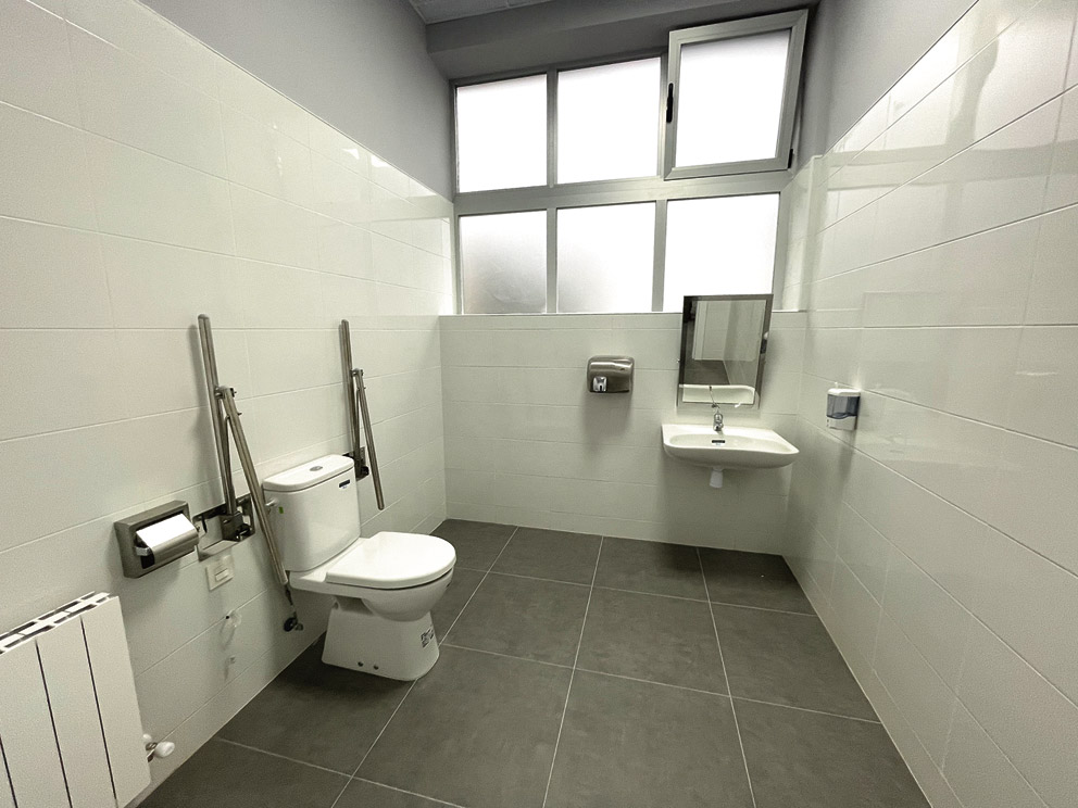 Estas nuevas instalaciones cuentan ahora con tres aseos: uno dispone de tres lavabos y tres inodoros; otro dotado con dos lavabos, dos urinarios y tres inodoros; y un aseo accesible con un lavabo y un inodoro.