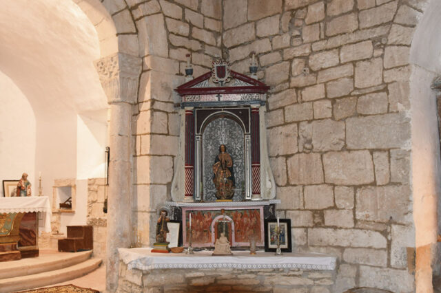Enfrente de dicho retablo se encuentra otro con un santo Obispo y dos imágenes de la Virgen María.