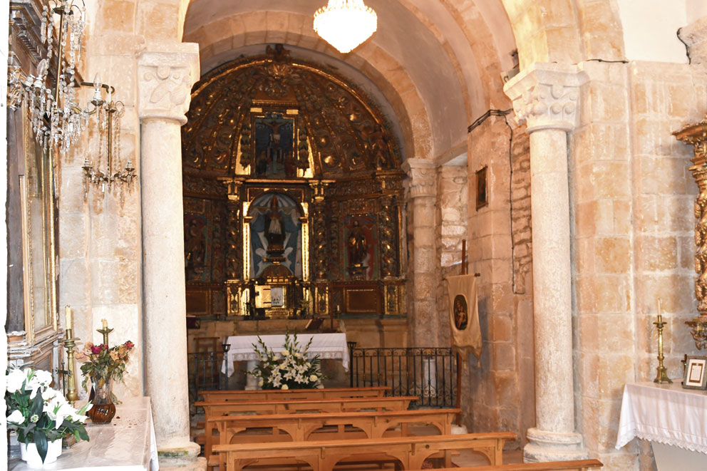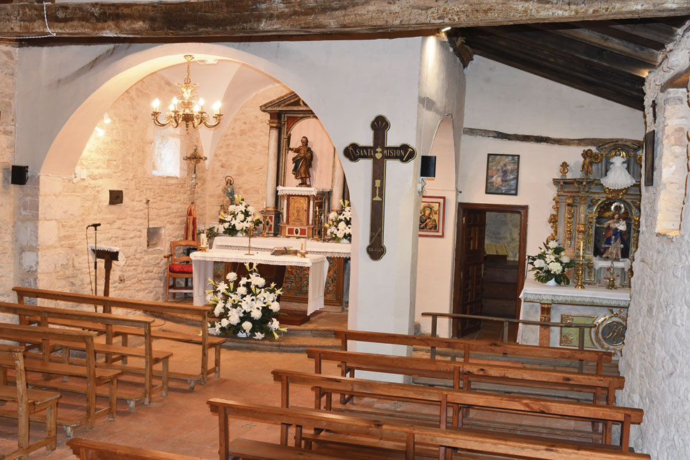 Cerca del presbiterio, en el lado izquierdo se conserva una lápida tardomedieval con el escudo de Cristóbal Rueda Salazar. Aunque no haya referencias de sus armas nobiliarias también está enterrada su esposa Juliana de Porres. El retablo de la derecha dedicado a la Virgen es obra barroca. El retablo principal es neoclásico, aunque la imagen del titular es una talla barroca.