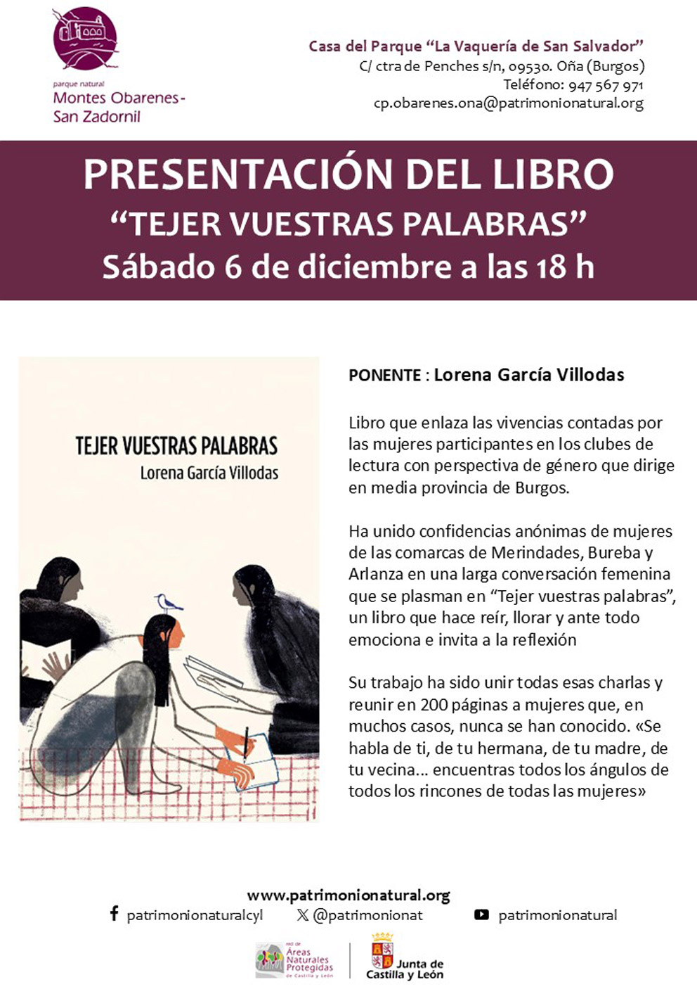 Tendrá lugar el próximo sábado 6 de diciembre, a las 18 h. en la Casa del Parque Montes Obarenes San Zadornil” de Oña.