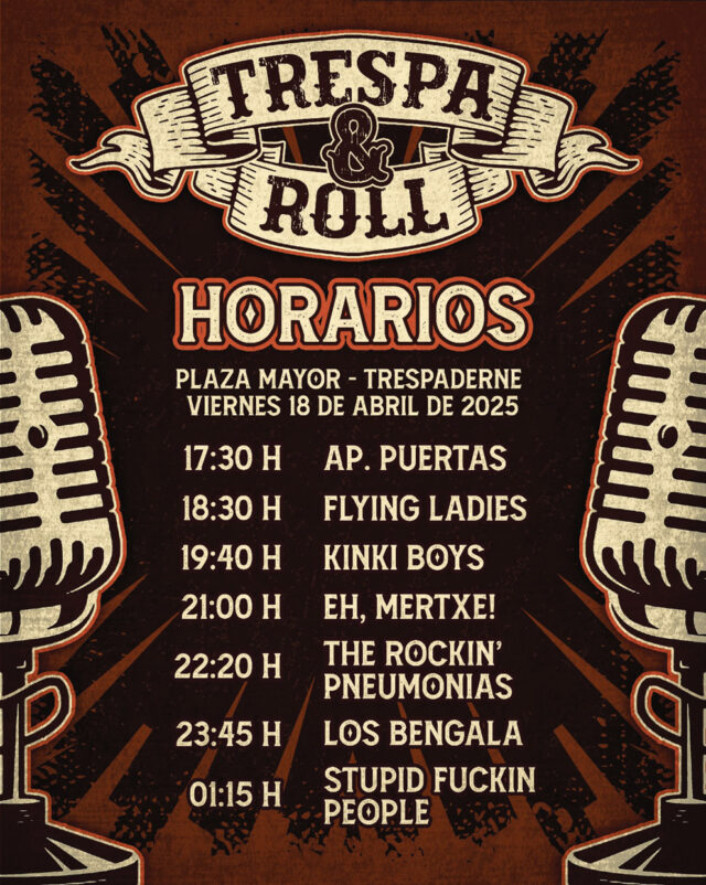 Los seis grupos que actuarán en la plaza de Trespaderne serán: Los Bengala, Eh, Mertxe, Stupid Fucking People, Flying Ladies, Kinki Boys y The Rockin´Pneumonias. El precio de la entrada anticipada es de 15€ (www.woutick.es) y en taquilla de 20€. Ya tenemos los horarios que se pueden ver en el cartel adjunto.