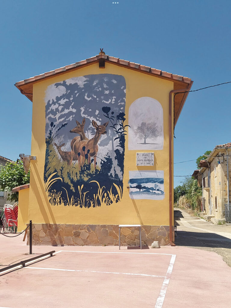Cada estación se representa con un detalle singular: Primavera, un campo de amapolas y un cerezo repleto de cerezas rojas, acompañado por dos petirrojos. Verano, la fachada principal, que da a la plazoleta del pueblo, se llena de vitalidad con girasoles que ascienden la pared y la presencia de una abeja que se acerca. Otoño, dos murales muestran, por un lado, un bosque teñido de tonos ocres con las cantharellus como protagonistas, y por otro, hojas de roble con bellotas, protagonistas del otoño en Valdivielso. Invierno, un paisaje envuelto en grises y niebla, donde tres corzos evocan la calma de la estación.