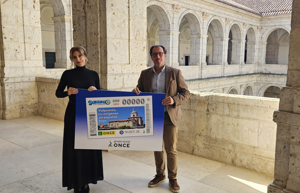 La viceconsejera de Acción Cultural, Mar Sancho, y el delegado de la ONCE de Castilla y León, Ismael Pérez, han dado a conocer la imagen del cupón de la ONCE del domingo 19 de octubre en el que la Colegiata de Santa María de Valpuesta, es la protagonista. Cinco millones y medio de cupones difundirán la imagen de esta localidad burgalesa.