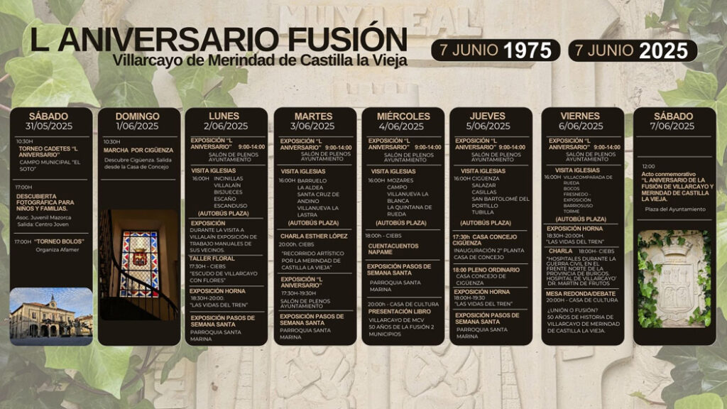 Para celebrar este aniversario tan significativo, el Ayuntamiento de Villarcayo de M.C.V. creó un grupo de trabajo para preparar un programa especial de actos conmemorativos que se desarrollarán durante una semana, desde el sábado 31 de mayo hasta el sábado 7 de junio. Entre ellos destacan la exposición L Aniversario, las visitas a diferentes iglesias del municipio, charlas, talleres, exposiciones, el pleno ordinario del Ayuntamiento que se celebrará en la Casa Concejo de Cigüenza, la presentación del libro “Villarcayo de MCV 50 años de la fusión de dos municipios” o el acto conmemorativo “L aniversario de la fusión de Villarcayo y Merindad de Castilla La Vieja”.
